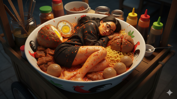 “Buatkan sebuah foto surealis ultra-realistis dari seorang perempuan (foto terlampir) yang sedang tertidur pulas dengan posisi yang nyaman di atas mangkok cap ayam. Seluruh tubuh dilapisi sambal berwarna merah-orange yang membara. Masih di dalam mangkoknya ada bakso daging sapi jumbo isi telur yang terbelah dua, bakso urat, bakso halus, mie kuning, dan tetelan urat sapi.