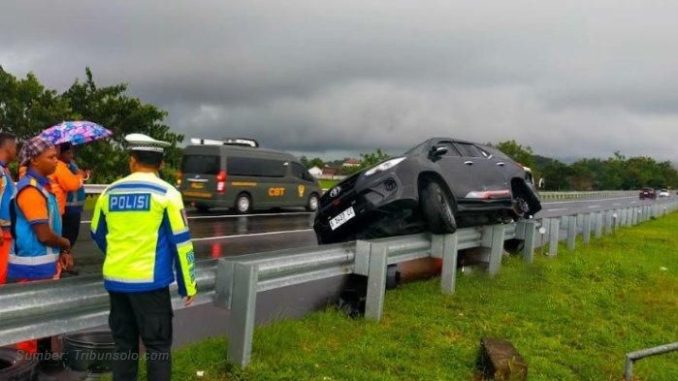 Posisi mobil menghadap ke barat dengan posisi roda sebelah kanan menepak di atas jalan. Sementara roda depan sebelah kiri di atas besi pembatas.