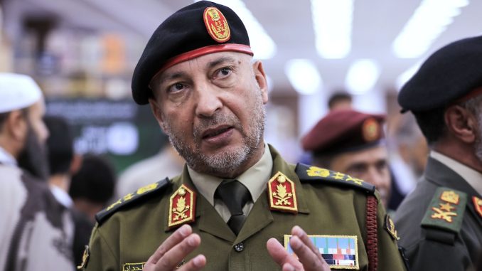 Chief of the General Staff of the Libyan Army, Mohammed Al-Haddad, speaks during the opening of a book fair in Tripoli, Libya Monday, April 21, 2025. (AP Photo/Yousef Murad)