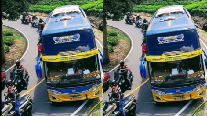 Di media sosial beredar luas sebuah video rombongan pengendara motor yang tiba-tiba menghentikan laju bus di area turunan dan tikungan. Salah satu pengendara motor Yamaha Nmax terlihat memotong jalur bus, kemudian berhenti seolah-olah menghadang kendaraan besar tersebut.