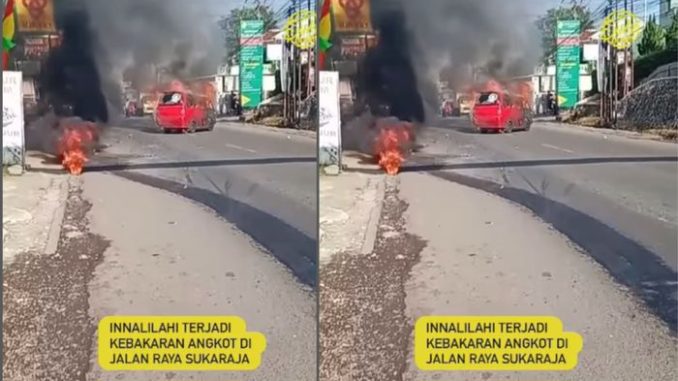 Kebakaran angkot terjadi di Jalan Raya Sukaraja, RT 003 RW 003, Desa Pasirhalang, Kecamatan Sukaraja, Kabupaten Sukabumi, Jawa Barat, pada Kamis pagi, 7 Agustus 2025.