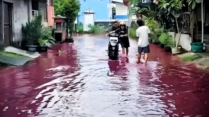 Salah satu warga, Jumadi, mengaku terkejut ketika melihat air setinggi betis yang masuk ke rumahnya tiba-tiba berwarna merah pada Rabu pagi.