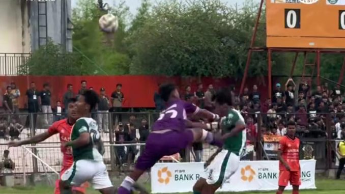 Kiper PSIR Rembang, Raihan Al Fariq, berusaha mengantisipasi bola dengan mengangkat kaki kanannya sangat tinggi.