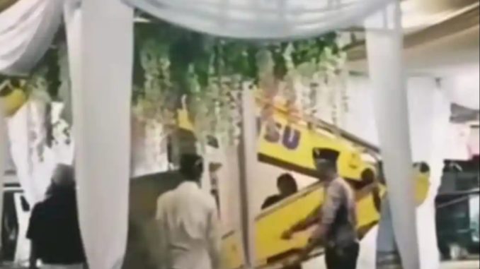 Ekskavator itu bergerak perlahan dengan lengan pengeruk diturunkan agar tidak menyentuh bagian atas tenda. Beberapa warga tampak membantu mengarahkan operator saat alat berat melewati jalur sempit di bawah tenda hajatan.