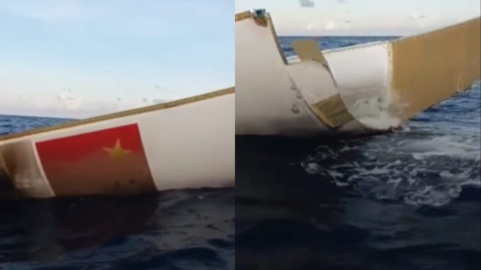 Rekaman video yang beredar luas di media sosial memperlihatkan potongan besar berwarna putih dengan gambar bendera China yang terlihat jelas di permukaannya.
