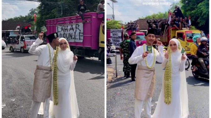 Dalam video yang beredar, pasangan tersebut tampak mengenakan busana pengantin putih. Mereka tersenyum sambil memamerkan buku nikah, sementara di belakang mereka terlihat arak-arakan truk serta mobil bak terbuka yang dipenuhi demonstran lengkap dengan spanduk tuntutan.