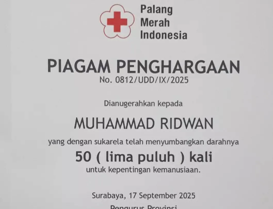 Dalam unggahan itu terlihat bahwa piagam penghargaan diberikan oleh PMI Jawa Timur pada 17 September 2025 dan ditandatangani langsung oleh Ketua PMI Jatim, H. Imam Utomo S.