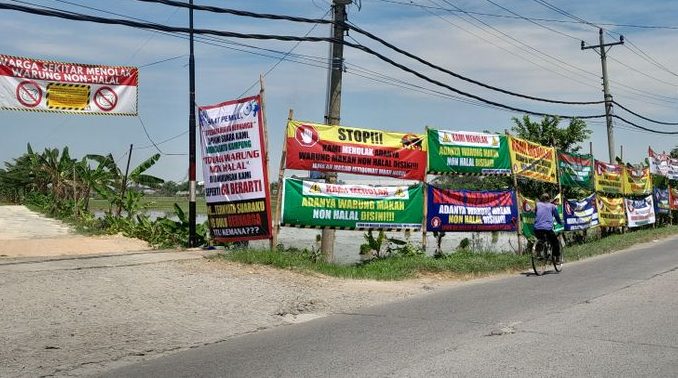 Puluhan spanduk penolakan terhadap kuliner nonhalal dipasang di sepanjang Jalan Setya Dharma, Desa Parangjoro, Kecamatan Grogol, Kabupaten Sukoharjo, pada Senin (20/4/2026). Aksi ini menjadi bentuk protes warga terhadap keberadaan warung Mie dan Babi Tepi Sawah yang lokasinya sekitar 100 meter dari masjid pertama di desa tersebut.