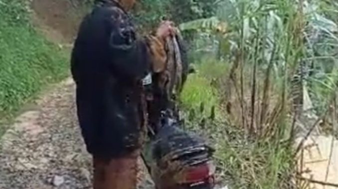 Imbas timbunan longsor terlalu tebal, Aris dan motor yang digunakannya itu terjatuh hingga tubuh dan pakaiannya tersebut basah dipenuhi dengan tanah.