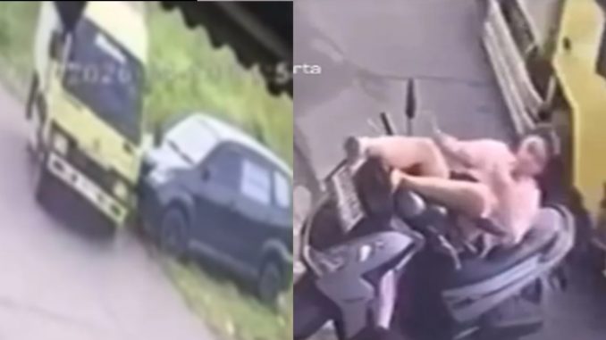 “Untung wanita yang sedang tiduran di motor tidak kena,” tulis keterangan tersebut.