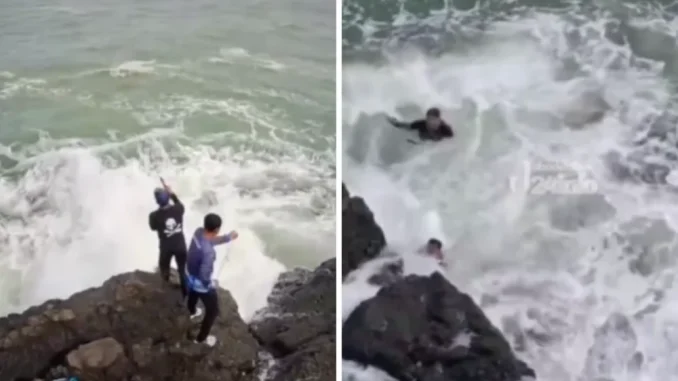 Peristiwa ini terekam dalam video berdurasi 1 menit 19 detik yang kini beredar luas di media sosial. Dalam rekaman tersebut terlihat dua pemancing berada di atas tebing karang yang langsung berbatasan dengan lautan. Suasana awal tampak aman, hingga salah seorang pemancing berbaju hitam terlihat sedang berusaha menarik kailnya yang diduga disambar ikan besar. Temannya yang mengenakan baju biru kemudian naik untuk membantu.