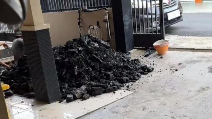 Kejadian bermula ketika para pekerja bangunan tengah melakukan renovasi rumah dan menggali tanah di bagian depan teras. Saat kedalaman lubang bahkan belum mencapai satu meter, material berwarna hitam pekat sudah terlihat jelas.